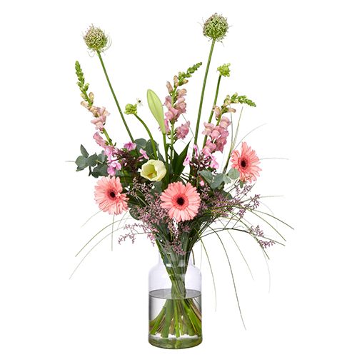 Eline est notre magnifique bouquet aux couleurs rose pâle et violet avec une combinaison de fleurs comme le gerbera, le limonium et l'ornithogalum. Bref, c'est époustouflant !